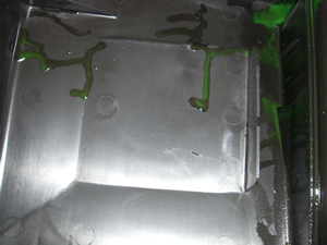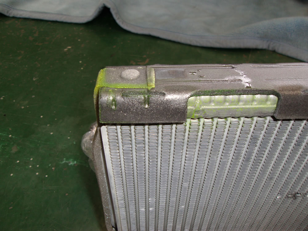 ユニットの右下に黄色い筋、ケースの内側に黄色い液が付いています。これがガス漏れの証拠です。目視で分かるほど漏れがひどいです。ここまでする分解時には、確実に漏れている確証がないと作業は出来ません。簡単に分解出来ません。