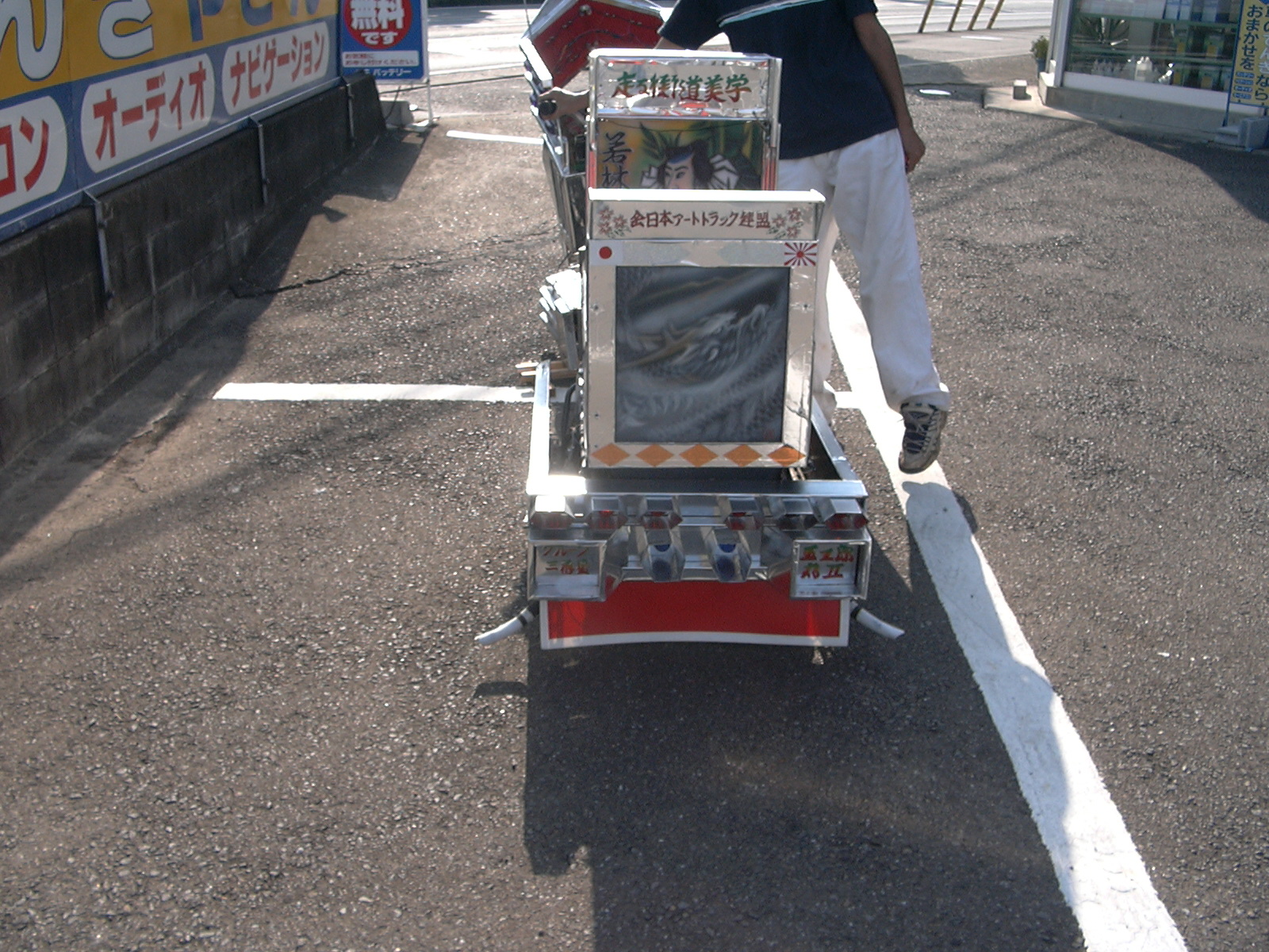 壱號機 なんだかんだ言いながら社長は笑顔です。こいつはエアホーン付きでトラックと同じ爆音のホーン音が出ます。因みにライト類はダミーではなくちゃんとすべて点灯しますw後ろはトラのエアブラシらしき塗装が施されています。TVチャンピオンでやらないかなぁ・・・。