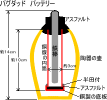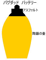 1836 年バグダッド近郊で約 2000 年前に作られたと見られる不思議な陶器製の容器が発見されました。その容器の内部には銅版で出来た円筒があり、アスファルトで出来たふたで円筒と鉄棒は絶縁されていること、鉄棒はふたを突き抜けていることから、 1940 年にドイツのコーニングは、この陶器の容器に 電解質 をいれると電池になるという報告をしました。これがバグダッドバッテリーですが、電池として使用されたかどうかは不明です。 |