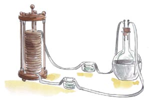 カエルの動物電気の話を聞いた ボルタ はガルバニーとは異なった解釈をしました。それは、二つの異なる金属間に湿った物質があると電気が流れるのではないかという考え方でした。 1800 年にボルタは銅版と亜鉛板の間に塩水で湿らせた厚紙を挟んだものを多数積み上げた ボルタの電推 を作って、連続的な電流が得られる電池を発明しました。ボルタは各種の金属の組み合わせを試みた結果、亜鉛と銀が最も適していることに気づきましたが、これで火花が発生するような高い電圧の電池を作ることはできませんでした。