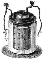 1844 年にグローブはダニエル電池よりも強力なグローブ電池を発明しました。発生電圧はダニエル電池の約 2 倍で電流も多く流すことができました。当時の米国では、長距離の電信には強力な電池が必要であったことから、この電池は電信用の電池として広く使用されるようになりましたが、有毒なガスを発生させることと高価な白金を使用していることから、 1860 年代までには安価なルクランシェ電池に置き換えられました。 |
