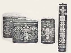 1886 年ガスナーはルクランシェ電池の電解液をセメントで固めた電池を発明しました。発生電圧は約 1.5 ボルトでした。従来の電解液を使用した電池に比べ、この乾電池は取り扱いが容易なことから、懐中電灯などの携帯用の電気製品の需要が拡大しました。日本では屋井 先蔵は炭素棒にパラフィンを含浸する乾電池を 1887 年に発明しました。 |