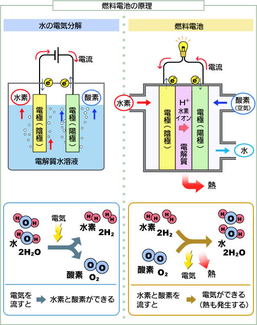原理的には1839年 イギリス のグローブが白金黒(はっきんこく)(白金の黒色粉末)付き白金板からなる正負両極を希硫酸中に浸し、水素と酸素を両極に吹き付ける方式の電池を作成したのに始まる。電気エネルギーを得ることに成功したが十分なものではなく、1960年代になって改めてその特徴が注目され、 宇宙船 の電源として実用化が進められた。その後、 火力発電 の代替用の高効率で環境に優しいオンサイト(家庭、事業所あるいは地域ごとの発電)用として、また 電気自動車 ( 燃料電池車 )用電源の有力候補として、そして 携帯電話 などのモバイル機器用の小形で高エネルギー密度の電源として、各国政府機関や大学、企業などで活発に研究開発が進められている。 |